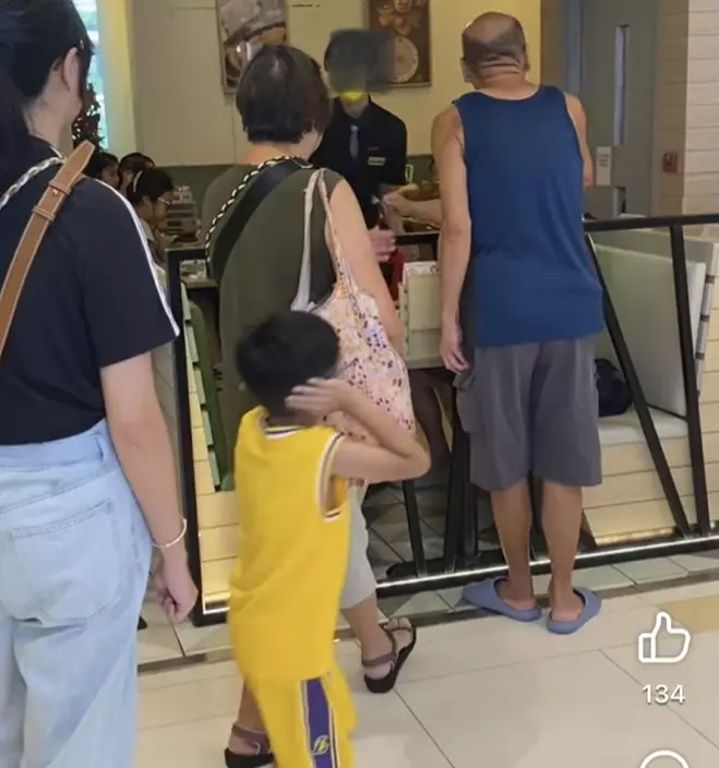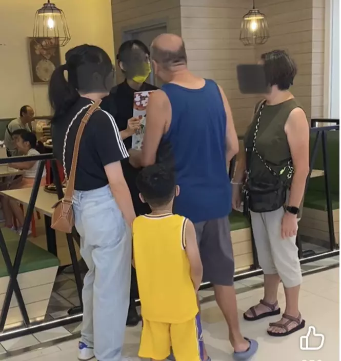 此時一名伯伯食客看不過眼他們為難職員,挺身出聲制止「唔好嘈啦」、「人哋打工架咋」、「你搞X住人哋」、「你嘈住我啊」,大媽與大叔隨即走向伯伯食客並指罵「關你咩事啫,收聲啦!」,女職員見狀立即阻止他們衝入餐廳並大叫「你哋唔好嘈啦」、「阿叔!我求下你啦」、「你鬧我啦」,十分可憐。女職員不斷勸交,但大叔並不理會一直破口大罵,這時孫兒亦不斷著他們冷靜,而大媽亦怕罵戰升級,於是拉開大叔,並指「咪同佢拗啦,無知識嘅人,同佢講乜嘢!嘈乜嘢!」、「嚇親個孫喇」。