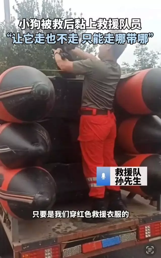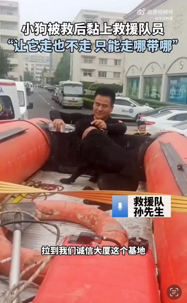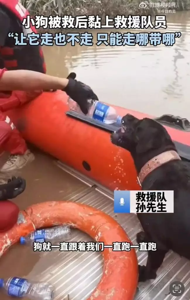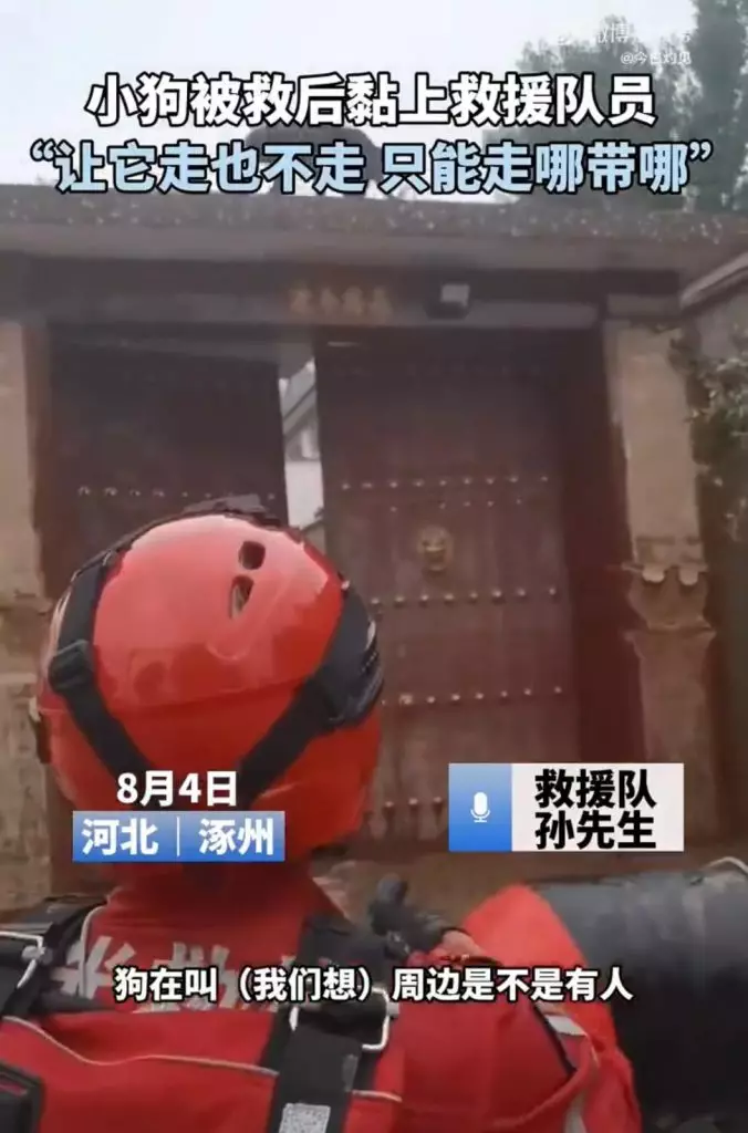 當日,搜救員划著橡皮艇經過河北涿州市的村子時,意外發現一隻黑色拉布拉多犬受困在家中大門上無法自行脫身,看到其驚慌的樣子,搜救隊員心生同情,便隨即將狗狗救下抱到船上,並餵牠礦泉水補充水分。