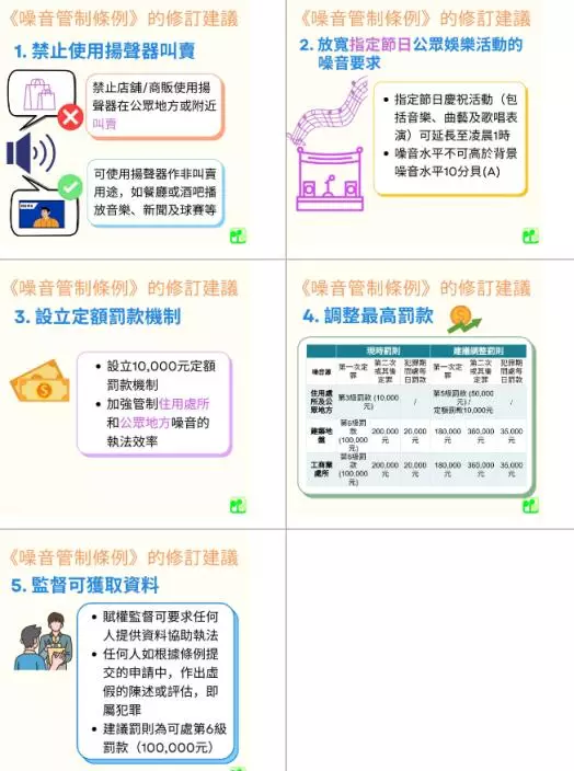 就當局研究,就住所及公眾地方發出噪音的其他罪行,設立1萬元定額罰款機制。葛珮帆表示支持,認為更具阻嚇力,否則罰款過少則有可能出現有商戶「交罰款當宣傳」情況。