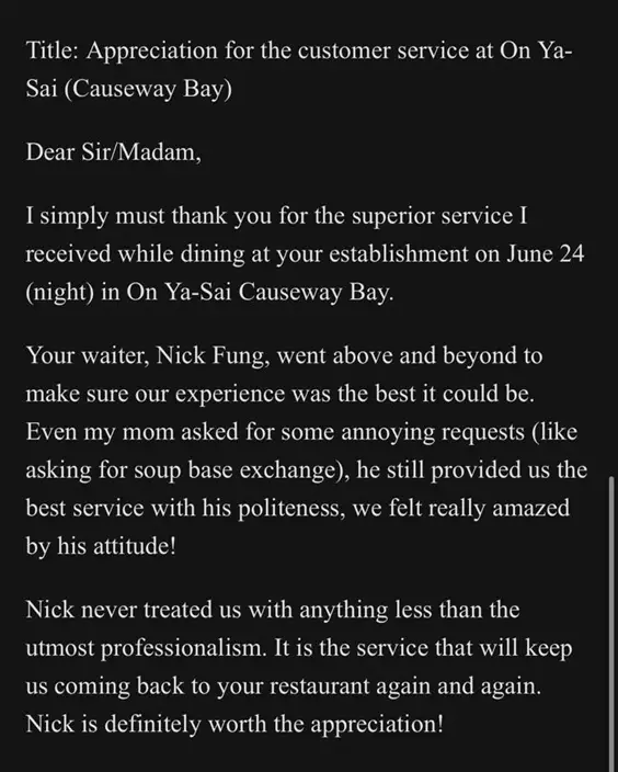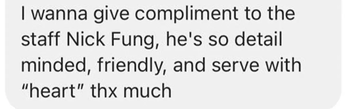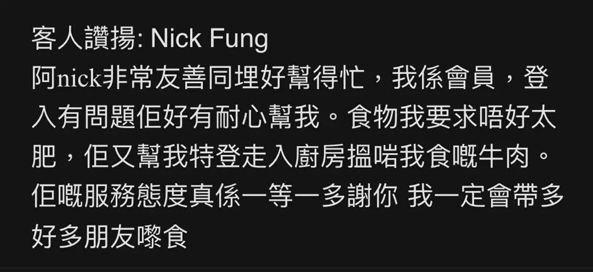 食客讚揚Nick細心的服務態度。