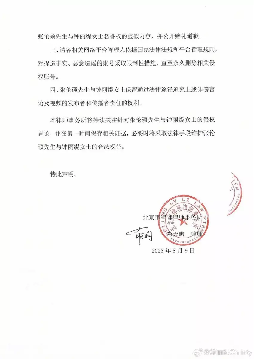 對於「張倫碩出軌」傳聞,鍾麗緹立即在社交平台晒出多張全家福及恩愛合照做出回應,並發表律師聲明,強調傳聞全是虛構,指傳聞造成名譽和形象產生不良影響,要求造謠者立即刪除不實內容,並表示會對有關帳號採取限制性措施,直到永久刪除侵權帳號。