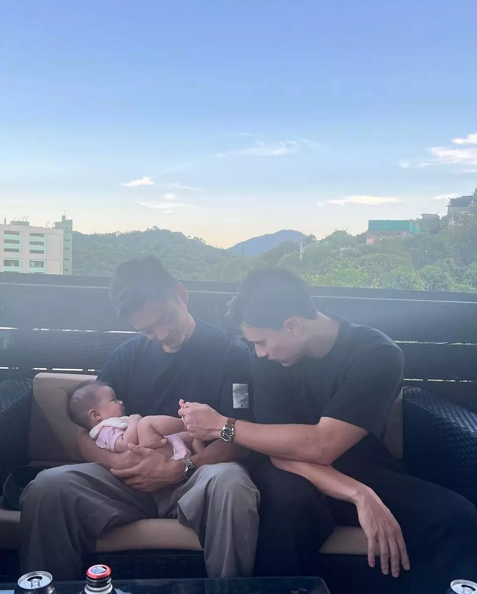 朱敏瀚分享一張他跟張振朗一起抱住BB的合照。