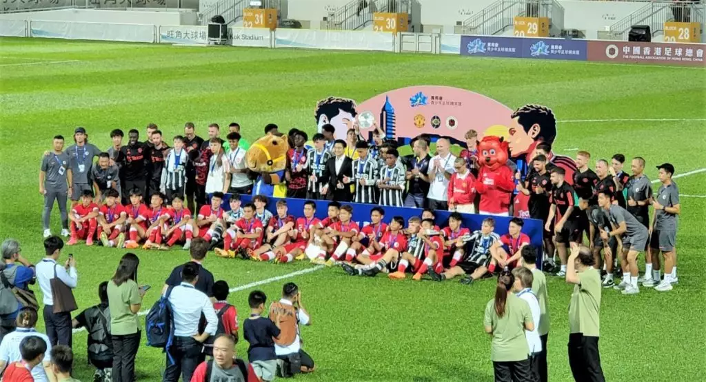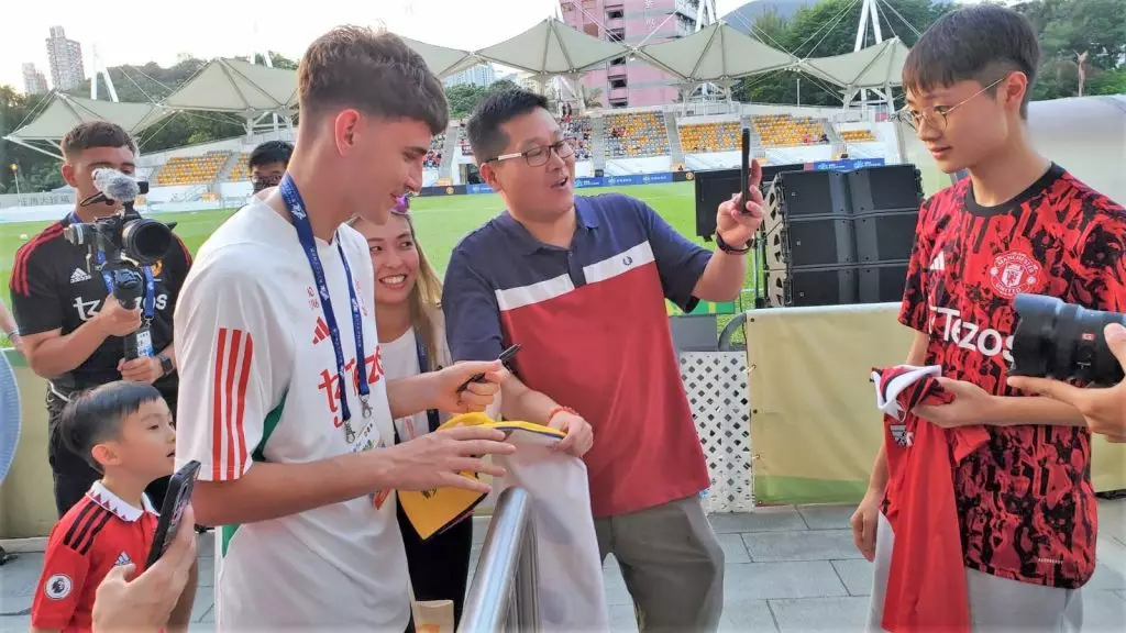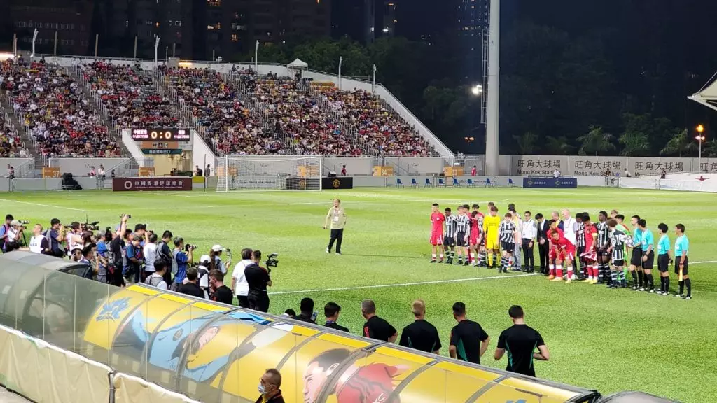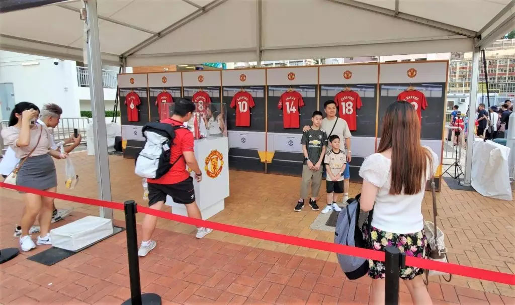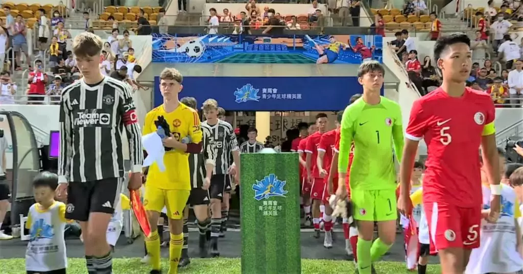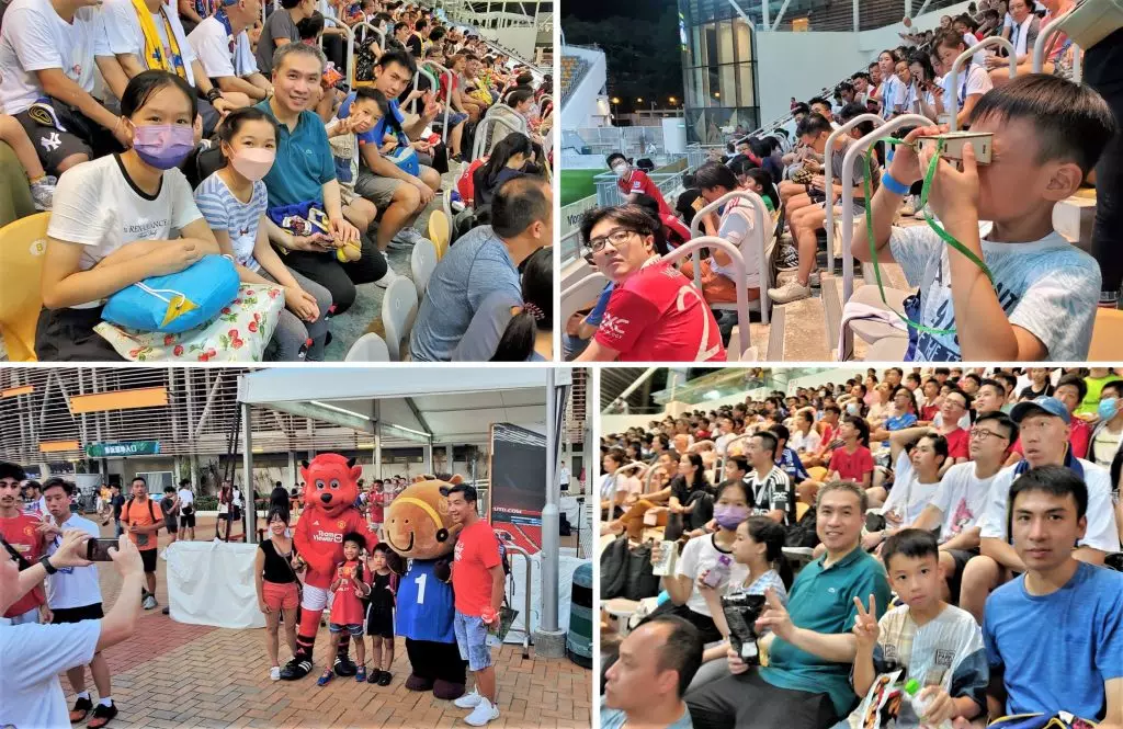 是次友賽為「開心香港」活動的其中一個重頭戲,由香港賽馬會響應並主辦「賽馬會青少年足球精英匯」,當中曼聯U16青年隊來港與香港青少年足球隊進行交流及比賽。筆者當天提早兩小時已到場,場內有不少攤位遊戲和打卡位與眾同樂,也見很多穿著香港或曼聯球衣的球迷入場「霸靚位」,當中更不乏一家大小,拖男帶女,作為家人朋友之間的美好聚會。筆者坐在看台中間偏右的位置,左邊便是曼聯香港官方球迷會的專用看台,所以未開賽打氣聲便絡繹不絕。對面的香港球迷們也不輸蝕,他們掛起「香港力量」、「香港勁揪」等橫額並不斷為港隊打鼓吶喊,場面熱鬧。