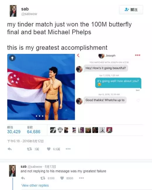 新加坡泳手舒古寧(Joseph Schooling)在里約奧運擊敗偶像「水神」菲比斯(Michael Phelps)成為全球焦點話題,有女網民看到這一幕「揼心口」,聲稱曾與舒古寧在網上曾經「邂逅」,但最終請對方「食檸檬」。