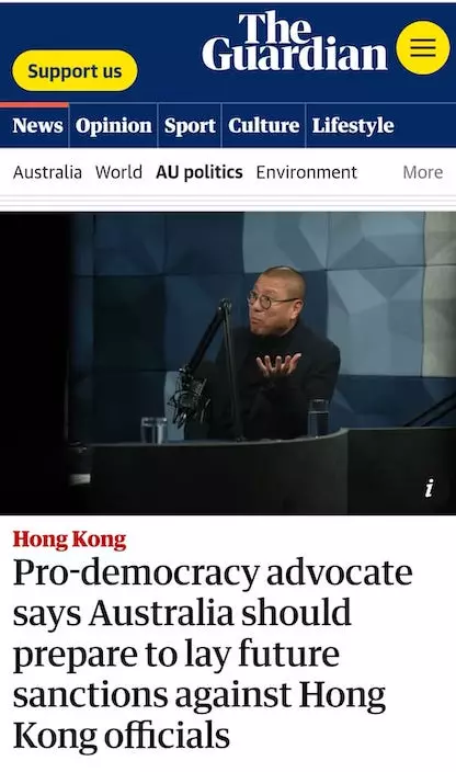 他高調呼籲外國政府制裁中國和香港特區,明顯是違反《香港國安法》的行為,可說犯完再犯,罪上加罪,但他擺明有恃無恐,坦言「自己正身處自由國家(澳洲),得到政府與朋友的充份支持」,所以不怕加碼一博。