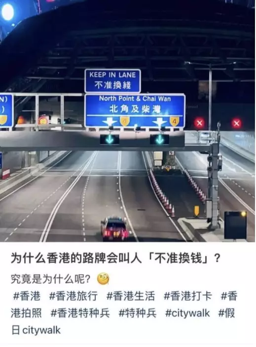 亦有網民指出其實參考英文「KEEP IN LANE」便一清二楚。有人則戲言「隧道接收差所以不要用手機轉錢,app有機會中bug,錢就消失」、「因為前面沒有找換店」、「原來係咁,所以成日冇現金係身」、「因為有外匯管制」。