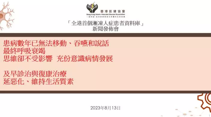協會表示,全港有約 200名肌萎縮性側索硬化症患者,即俗稱的漸凍人症。在義工協助下搜集得的漸凍人症患者資料庫,約佔全港患者四分之一,他們平均在55歲發病,推算有4至6成患者僅餘9個月存活。