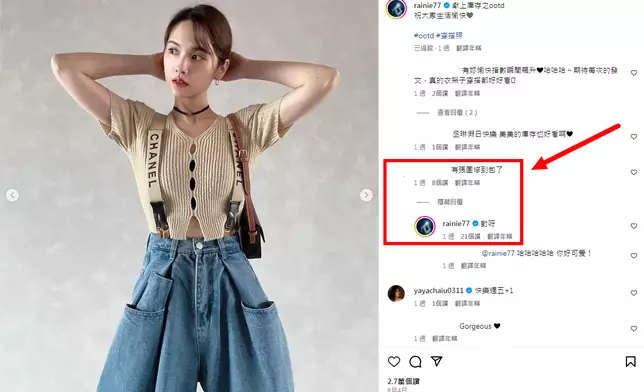 在分享的靚照中,楊丞琳穿著杏色短袖墊肩針織上衣,中間的紐扣排列式的鏤空設計很搶眼,隱約透露出裡面的內搭黑色背心,下身穿著配背帶的寬鬆牛仔褲,又甜又酷!吸引了唔少網民留言大讚:「美美的庫存也好看啊」、「穿什麼都好看的丞琳」、「好美啊啊啊啊啊」、「看到你的美照就很愉快啊,你的衣品超級無敵讚啊!」不過,有細心網民發現其中一張靚照中,楊丞琳背的包包模糊了一處,似乎是P圖的痕跡,忍唔住留言:「有張圖修到包了。」沒想到楊丞琳大方回應:「對呀。」網民表示自己被對方的誠實可愛到了!