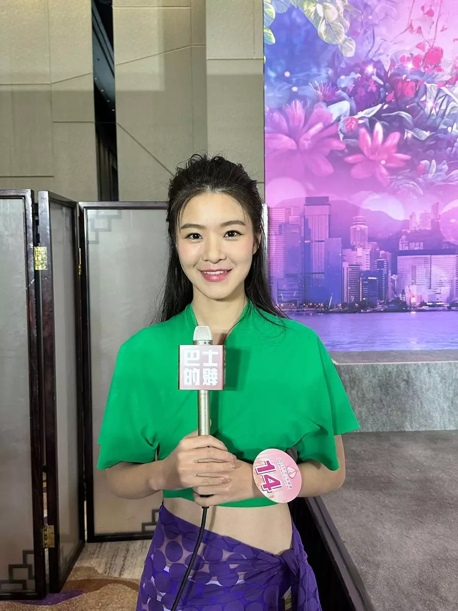 14號候選佳麗陳怡名(Zora)接受本報記者採訪時被問及第一次見傳媒的感受時,她回答道:「緊張,自己之前在越南曬黑了,怕穿泳衣不好看,並且今天穿的鞋業不太舒服,驚站不太穩。以及如果自己有地方出醜,怕公眾將其放大。」