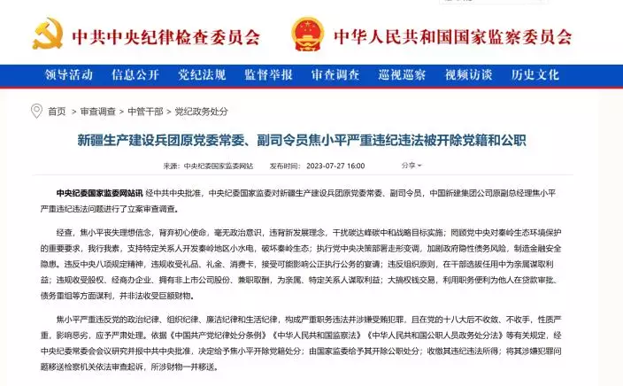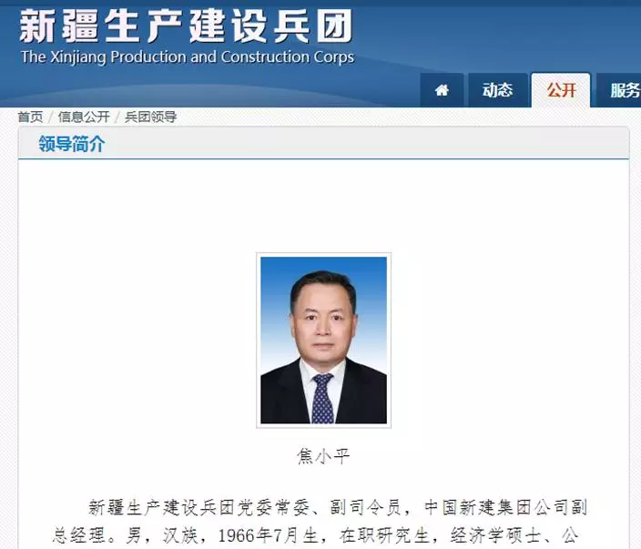 新疆生產建設兵團原黨委常委、副司令員,中國新建集團公司原副總經理焦小平涉嫌受賄,移送檢察機關審查。