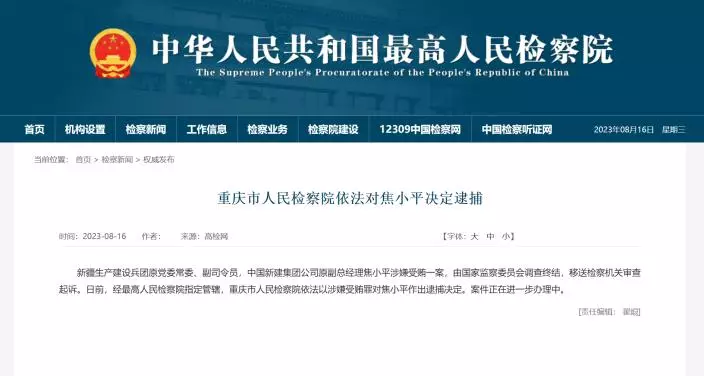 新華社報道,新疆生產建設兵團原黨委常委、副司令員,中國新建集團公司原副總經理焦小平涉嫌受賄一案,由國家監察委員會調查終結,移送檢察機關審查起訴。日前,經最高人民檢察院指定管轄,重慶市人民檢察院依法以涉嫌受賄罪決定逮捕焦小平。案件正在進一步辦理。