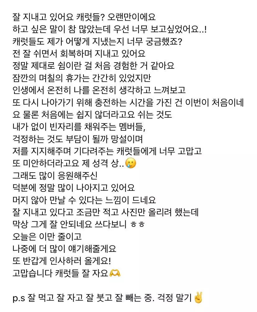 勝寛續說:「想特別感謝支持並等待我的CARAT們,同時也很抱歉,因為我性格的關係,但也多虧大家這麼支持我,我真的好多了!感覺不久後應該就能和大家見面了,本來只想簡短的告訴大家我過得很好,上傳點照片來著,但寫著寫著就這麼長了呢...今天就寫到這裡,以後再詳細講給大家聽,我會再來開心的問候大家的!謝謝大家,CARAT們,晚安!p.s我有在好好吃飯、睡覺,容易水腫但也好好消腫中,不用擔心!」分享休息中的近況叫大家不用擔心。而在8月16日韓媒《10asia》就引述消息指,勝寛或有機會在10月歸隊參與SVT的活動,相關消息曝光之後,許多粉絲亦在帖文下為勝寛加油打氣,並指會繼續期待他休養過後充滿電回歸。