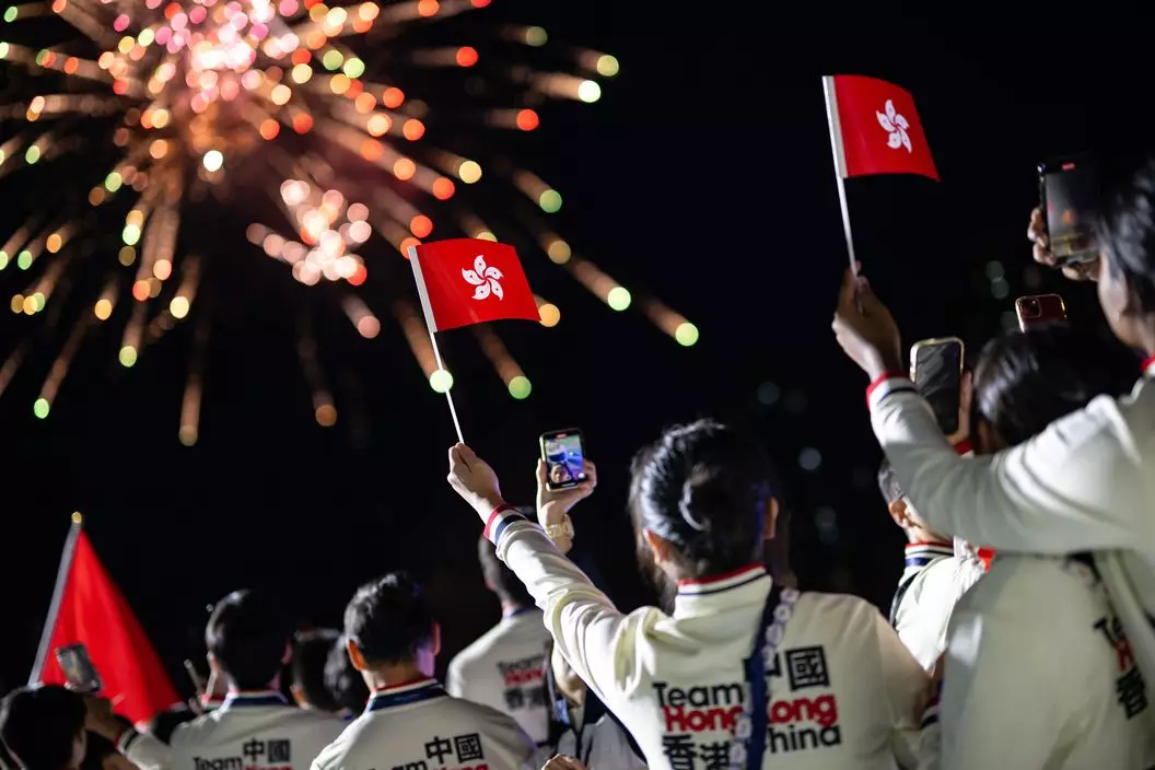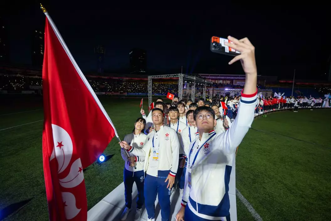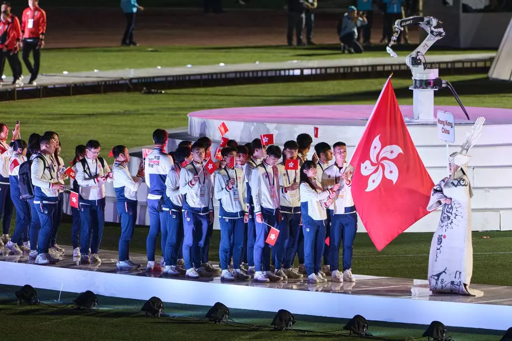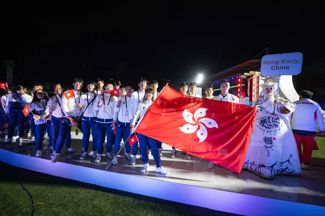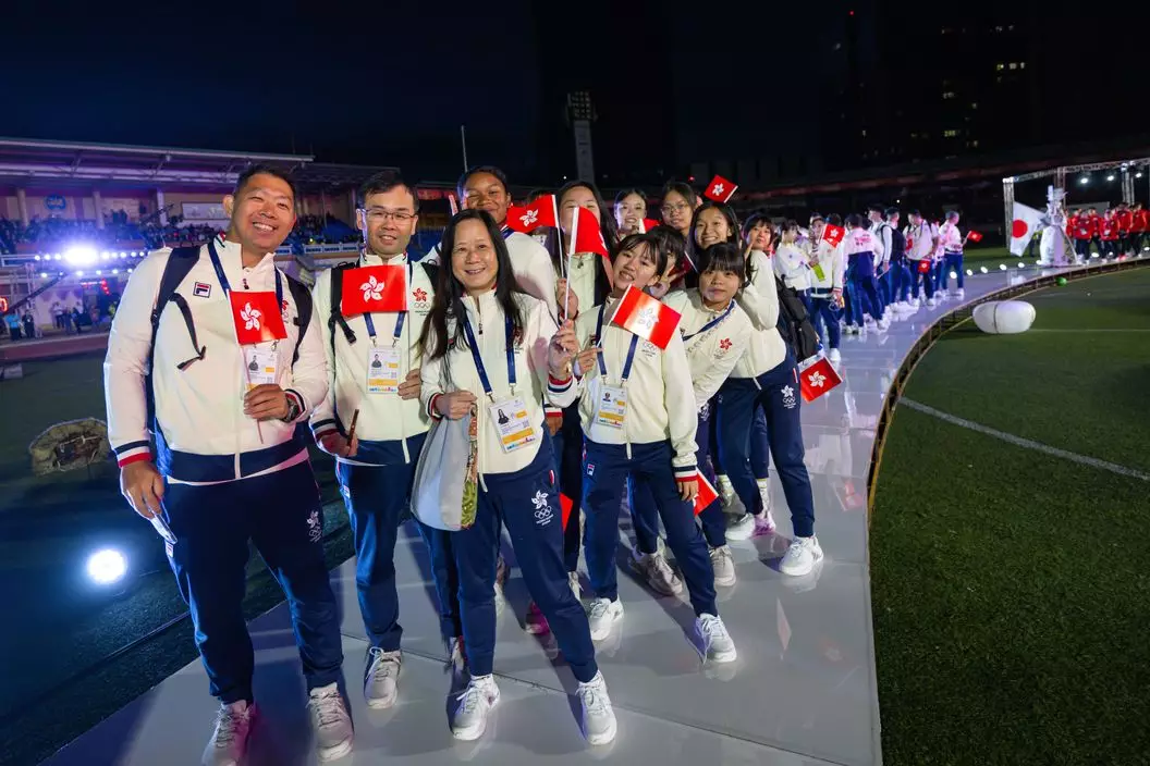 2023東亞青年運動會開幕禮17日晚上在蒙古首都烏蘭巴托「中央運動場」舉行。中國香港代表團由籃球運動員陳卓賢和柔道運員劉蕙芯擔任持旗手,與其他港隊代表進場參與慶典。