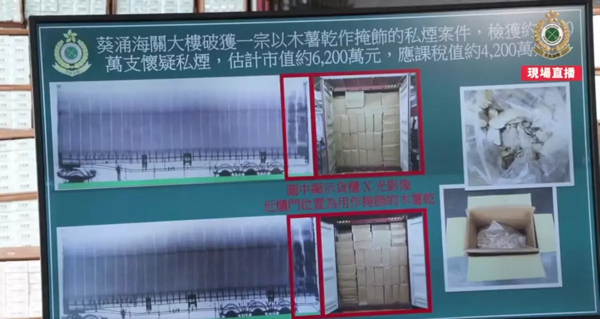 8月15日,海關在葵涌驗貨場以X光檢查這兩個貨櫃,X光影像顯示,近櫃門的貨物和較後位置貨物的密度不同。打開貨櫃後,發現較近櫃門的數十箱紙箱有一批切碎了的木薯乾,其餘紙箱都是載有懷疑私煙。