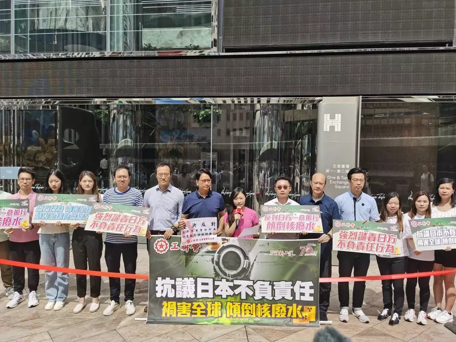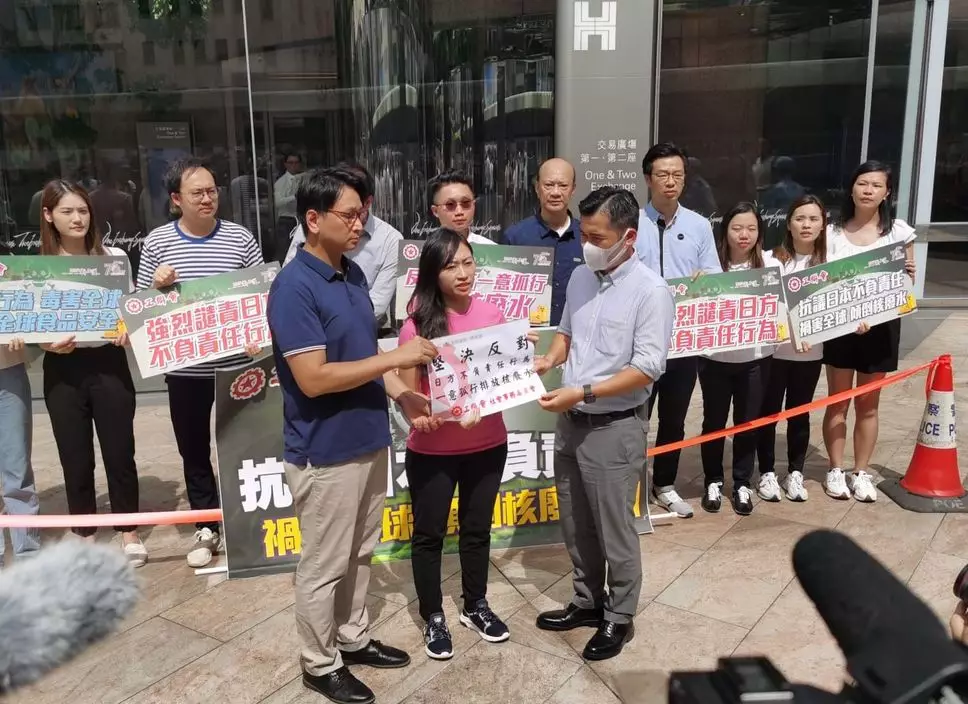 現場工聯會立法會議員陳穎欣、鄧家彪及團隊手持「反對日本傾倒核廢水」、「強烈譴責日方不負責任行為」、「危害全球食品安全」等的標語,高叫口號,向日方就事件表示強烈譴責。