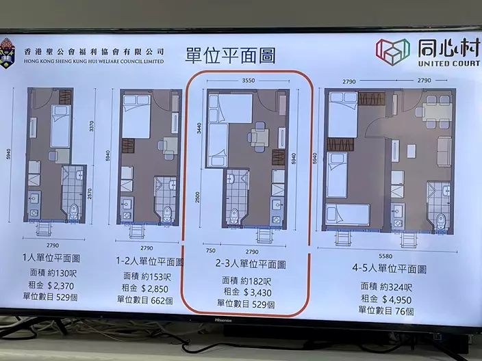 2. 租金便宜,這是過渡性房屋最吸引的地方。以同心村2至3人單位為例,面積182方呎,表面租金是3430元,但若輪候公屋超過3年就有政府津貼,實際租金大約2000元。現在政府還新增一筆過搬遷津貼。