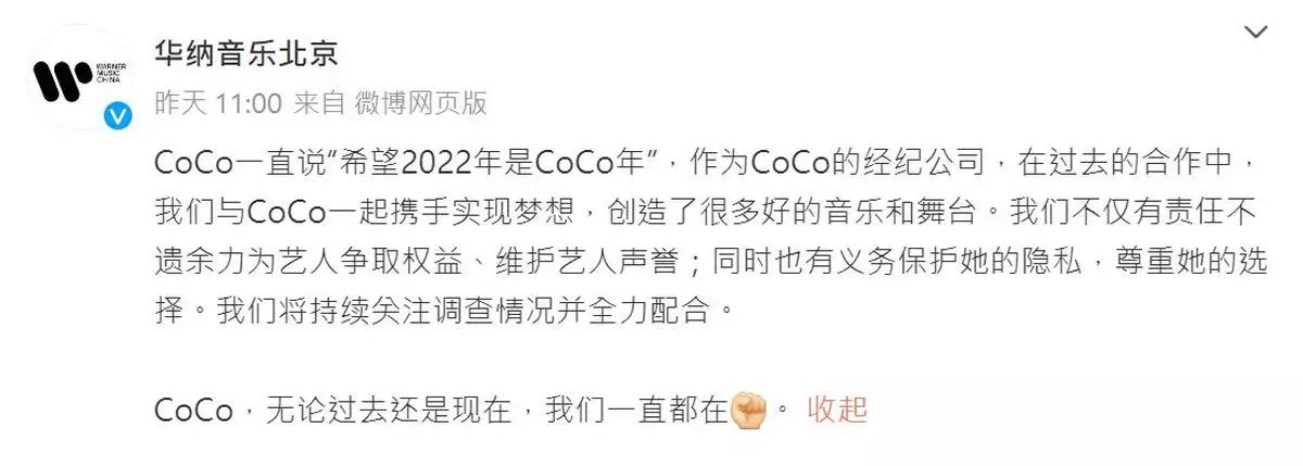 北京華納音樂在官方微博發聲明,表示:「CoCo一直說『希望2022年是CoCo年』,作為CoCo的經紀公司,在過去的合作中,我們與CoCo一起攜手實現夢想,創造了很多好的音樂和舞台。我們不僅有責任不遺餘力為藝人爭取權益、維護藝人聲譽;同時也有義務保護她的隱私,尊重她的選擇。我們將持續關注調查情況並全力配合。CoCo,無論過去還是現在,我們一直都在」。