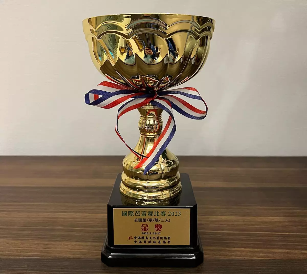 獎杯上寫着「公開組(單/雙/三人)金獎」。