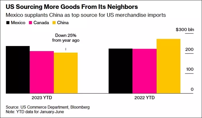 彭博社8月8日便報道,美國商務部的最新數據顯示,今年前六個月,美國從中國進口了約2030億美元的商品,比2022年同期減少了25%,墨西哥和加拿大已經取代中國成為美國最大的商品供應國。