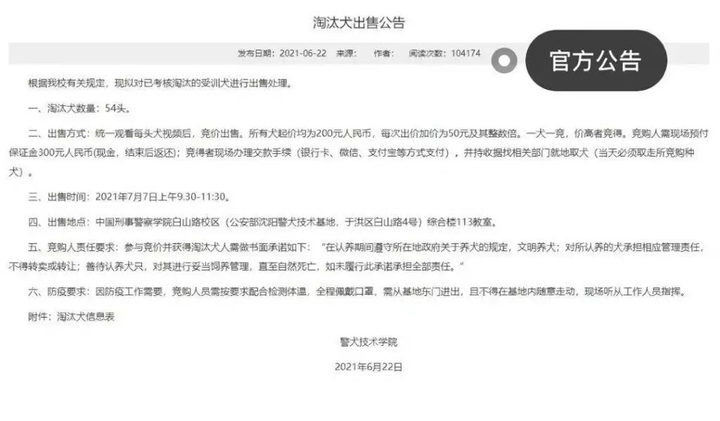 近日,微博用戶「喜氣洋羊子」分享了一則消息。一所專門訓練警犬的技術學院在2021年公布了「出售淘汰犬」的公告。根據該公告,學院計劃以競標方式出售共54隻在考核中被淘汰的犬隻。