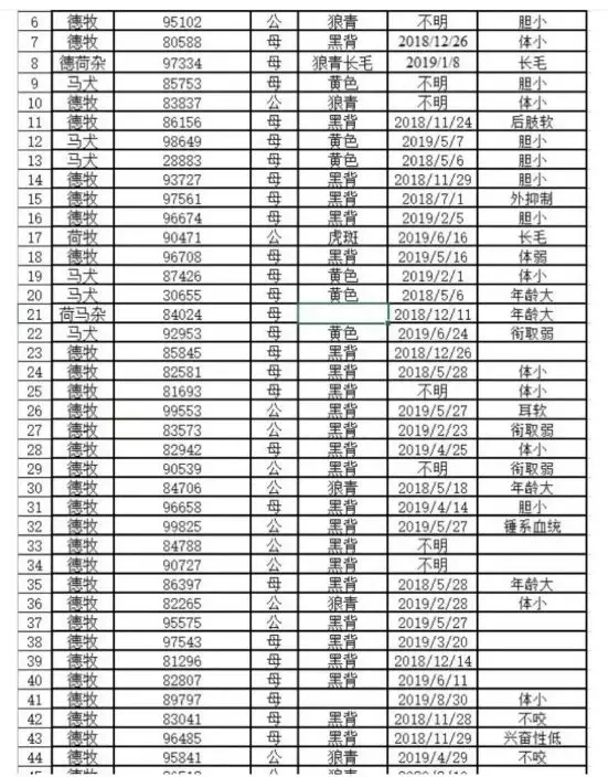 該微博用戶還公開了部分被淘汰犬隻的品種和詳細信息。列表中包括德國牧羊犬、荷蘭牧羊犬、比利時瑪連萊犬(馬犬),以及其他德荷或荷馬混種的米克斯犬。這些犬隻被淘汰的原因多種多樣,包括膽小、多毛、後肢軟弱、興奮性低、年紀大等。