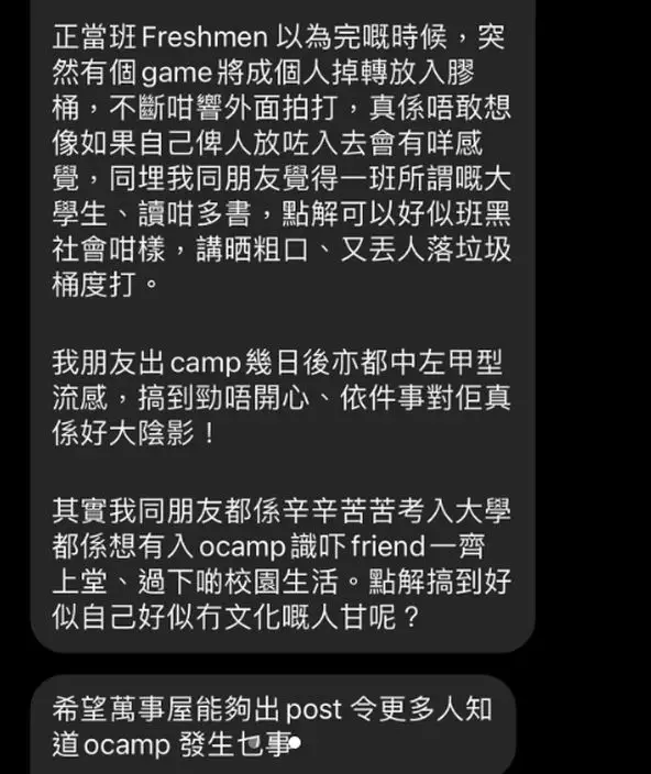 而營中還一個充滿暴力的遊戲,就是「將成個人掉轉放入膠桶,不斷咁響外面拍打」,「軒軒萬事屋」控訴「我同朋友覺得一班所謂嘅大學生、讀咁多書,點解可以好似班黑社會咁樣,講晒粗口、又丟人落垃圾桶度打。」
