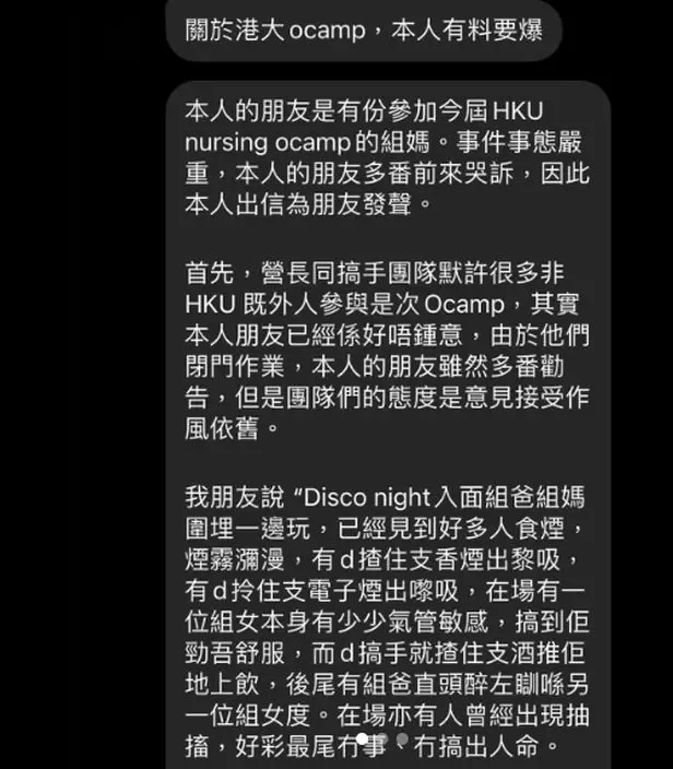 Instagram 帳戶「軒軒萬事屋」在社交平台發文,表示自己的朋友是有份擔任港大護理系迎新營「組媽」的學生,日前她前來哭訴,指該營的營長同搞手默許很多非港大的人士參與是次Ocamp,雖然該名「組媽」多次勸告,但團隊都沒有理會。