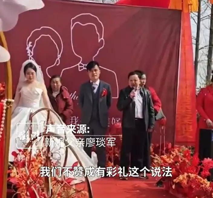 近日一則「婚禮現場岳父退還18.8萬人民幣禮金,僅留100元圖吉利」的影片在內地網絡刷屏,引發廣泛關注。影片中,新娘父親的質樸發言更打動無數網民:「年輕人,不要被金錢蒙蔽了自己的婚姻幸福。」