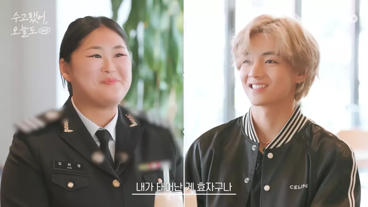 在8月31日發布的最新一輯《今天也辛苦了》,講述BTS的女粉絲河英(音譯:하영),目標是要成為一名「真.ARMY」當上軍人。她目前就讀韓國軍校,不過她的考核成績卻每况愈下,再加上頻密體能訓練,使她自信心也大受打擊、身心俱疲,擔心成為家人的負擔。製作組收到關於河英的故事申請,就特別為她安排和V見面,親自獲得偶像替她應援的機會。