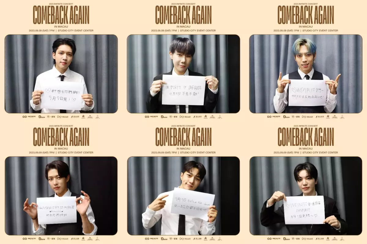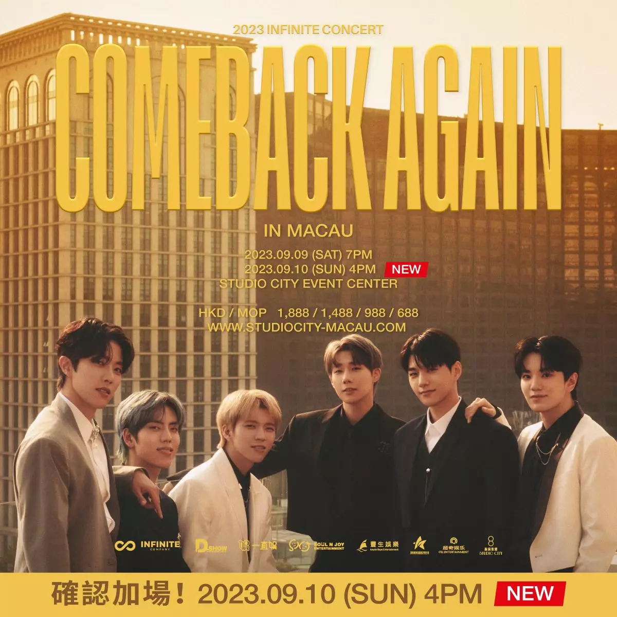 韓國男團INFINITE將一連兩天,於2023年9月9-10日(星期六、日)假澳門新濠影匯綜藝館舉行由INFINITE COMPANY和德碩文化傳播有限公司主辦的《2023 INFINITE CONCERT〈COME BACK AGAIN〉IN MACAU》,而日前亦宣布巡演最終場已定於9月28日在香港AXA X WONDERLAND舉行,主辦單位耀榮文化在9月1日釋出海報,稍後將公布售票詳情。