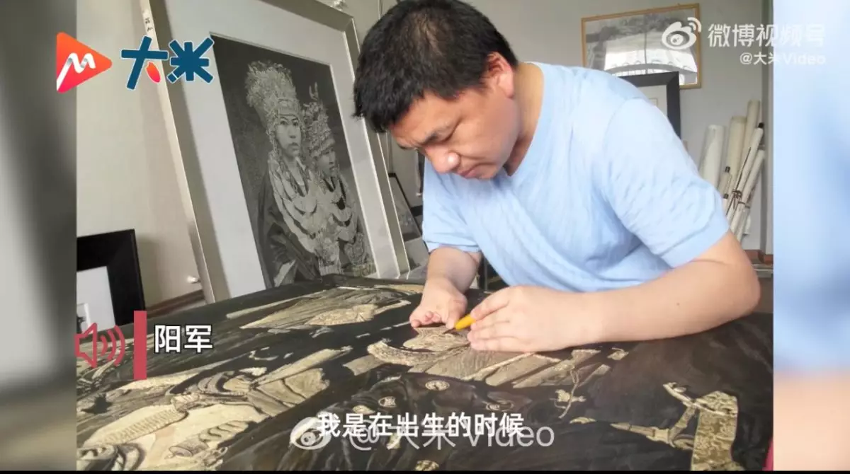 現年46歲的陽軍出生於湖南農村,因先天缺陷右手僅存一根拇指。在童年認知中,他只知道「農民」與「老師」兩種職業,卻立下心願:「我長大後一定要做老師。」憑著對藝術的熱愛,他以左手代替右手學習繪畫,後來考入國畫專業。自2008年起任教美術課,每日堅持專業訓練,強調「教師專業過硬,學生才能少走彎路」。