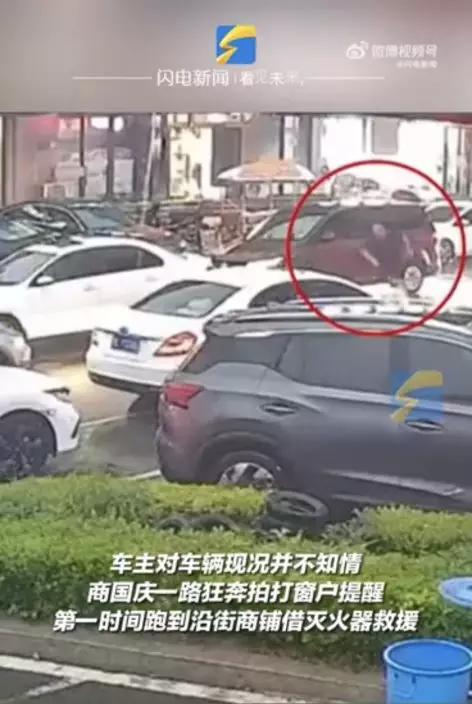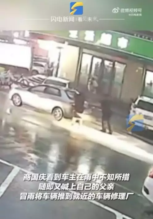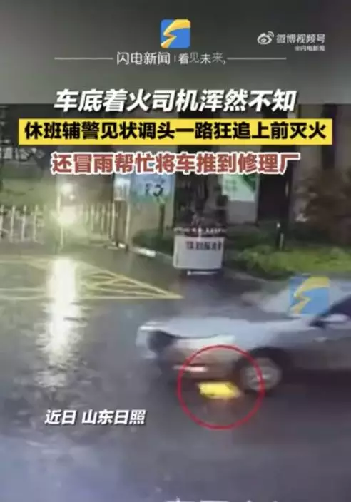 由影片可見,輔警在駕駛過程中,發現對面車輛車底有明火,於是開車掉頭追趕,只見他一路狂奔並拍打車窗提醒對方,但車主當下有些不知所措,隨後他馬不停蹄去附近商鋪借來滅火器將火撲滅,隨即喊上爸爸一起冒雨將車輛推到就近的修理廠。