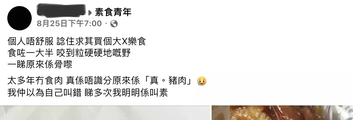 該港女於Facebook群組「素食青年」發文分享其中伏經歷,她表示日前感到身體不適,於是決定到附近的一家連鎖快餐店買外賣,點了「招牌焗素豬扒飯餐」回家享用。怎料,當她吃到一半時,突然咬到硬物,竟發現是骨頭「食咗一大半,咬到粒硬硬地嘅野,一睇原來係骨嚟」。