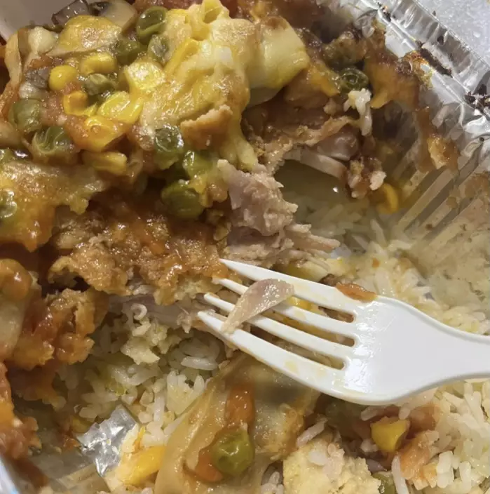 茹素港女於連鎖快餐店購買外賣「素焗豬扒飯」,豈料吃到一半時發現素豬扒有骨,才驚覺自己吃了真豬肉。