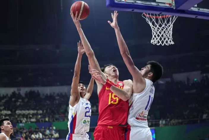 9月2日,中國隊球員周琦(中)在比賽中投籃。當日,在菲律賓馬尼拉進行的2023年籃球世界杯17-32名排位賽中,中國隊以75:96不敵菲律賓隊。新華網圖片