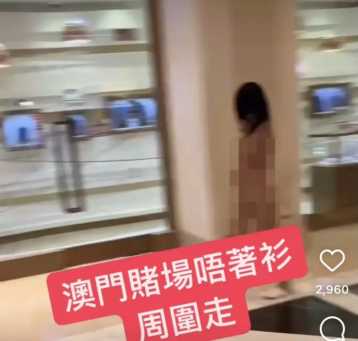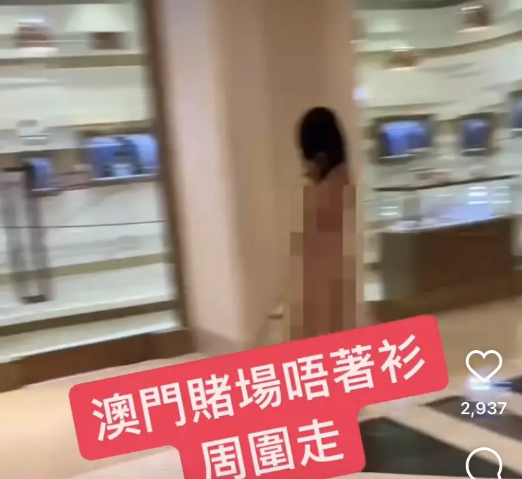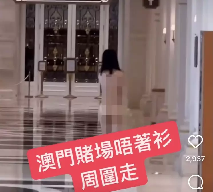 有網民於instagram以「澳門賭場唔着衫周圍走」為題上載一段短片,片中可以見一名長髮及肩、年約二三十歲的女子一絲不掛地在澳門巴黎人酒店大堂內遊盪。該女子全身赤裸,只有穿上一對酒店拖鞋,旁若無人般以急步漫無目的地周圍行走。片中未見有圍觀者或其他人經過,亦未見有酒店職員出現了解情況或予以幫助。