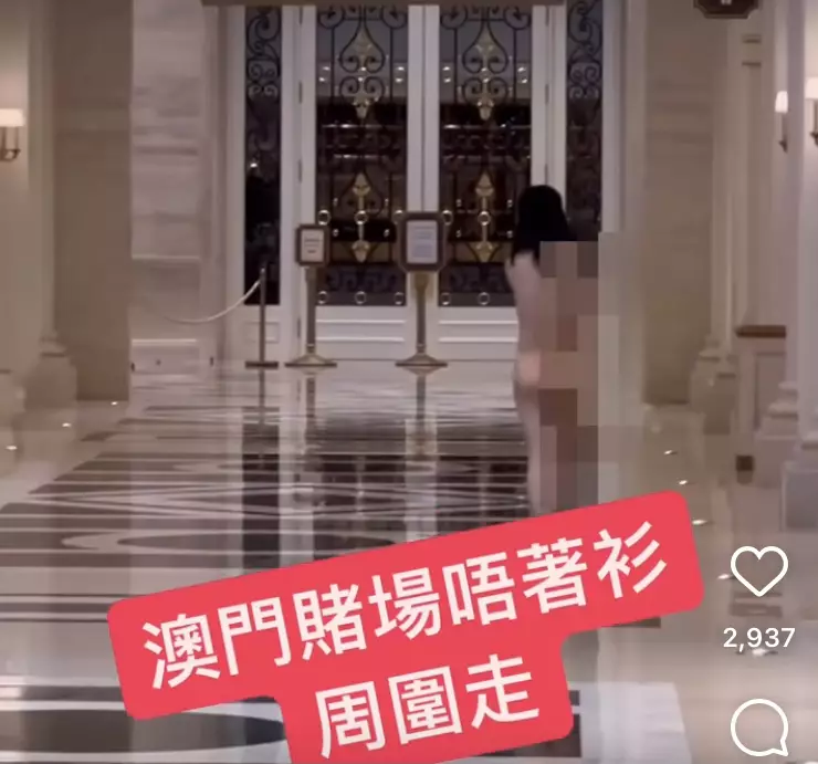 有網民拍攝到一名全身赤裸的年輕女子,於澳門巴黎人酒店內漫無目的地遊蕩,場面令人嘩然。(Instagram影片截圖)
