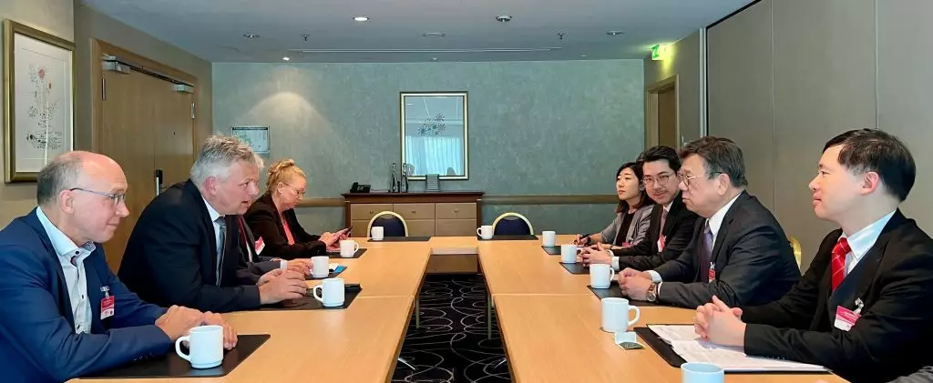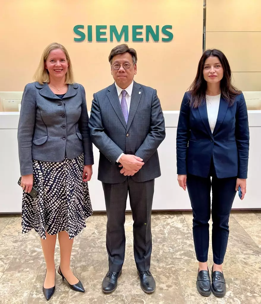 務及經濟發展局局長丘應樺(中)在德國慕尼黑與德國慕尼黑西門子金融服務集團行政總裁Veronika Bienert(左)會面,介紹香港的招商引資措施。政府新聞處圖片