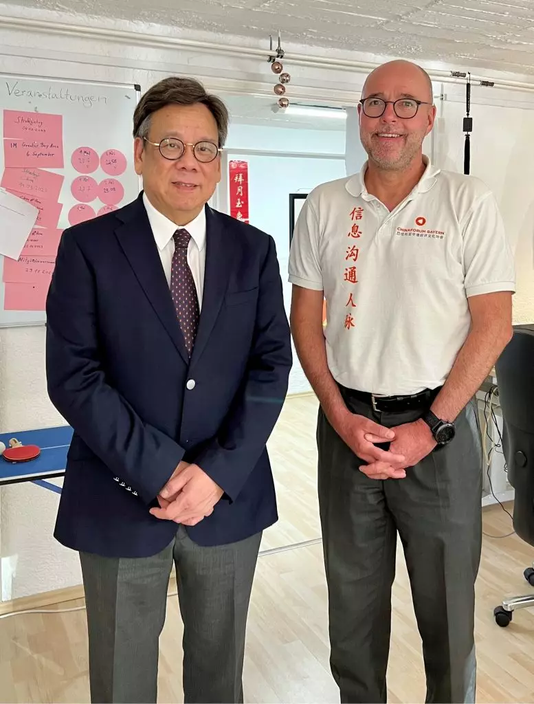 商務及經濟發展局局長丘應樺(左)在德國慕尼黑與巴伐利亞中德經濟文化協會執行主席兼董事會成員Stefan Geiger(右)會面,介紹香港和粵港澳大灣區的最新發展。政府新聞處圖片