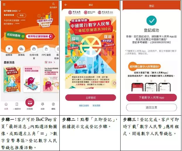 由即日起客戶可透過中銀香港本地及跨境流動支付應用程式 BoC Pay,申請開通數字人民幣錢包的使用資格 。成功登記後,便可下載數字人民幣應用程式開立錢包,並使用中銀香港手機銀行服務為錢包充值。