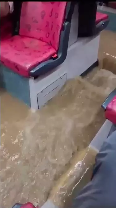 有巴士不敵湧至的洪水,失守慘變「渡輪」,網友戲稱是成功上演九巴版鐵達尼號。
