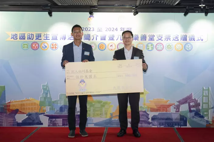 九龍樂善堂今年捐贈50萬港元,以資助懲教署和各分區滅罪會合辦助更生宣傳活動,支票由九龍樂善堂主席李聖根(左)代表致送,並由懲教署署長黃國興(右)代表接收。