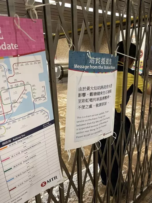 暴雨亦淹沒了黃大仙港鐵站,港鐵站關閉。而由於黃大仙中心北館的入口位於地庫,大量雨水不斷湧入地下一層水位已浸到頂部,牛奶冰室等商舖都被淹沒。