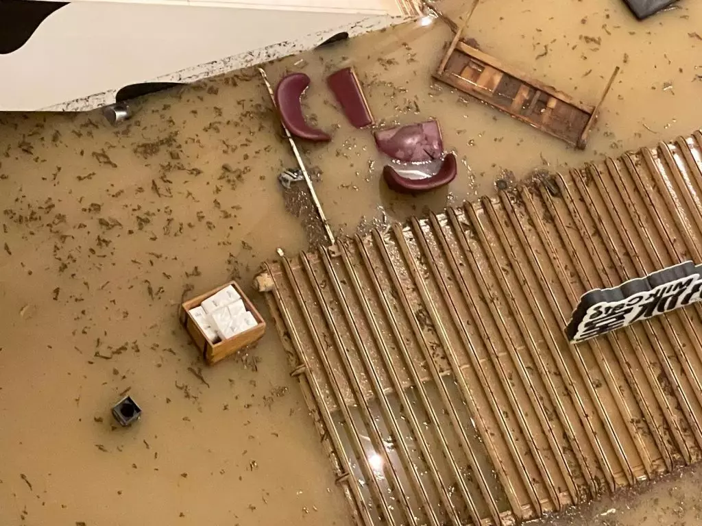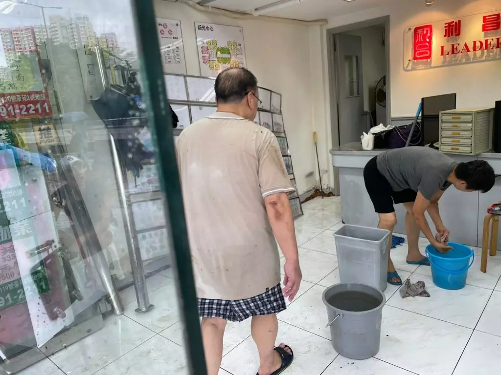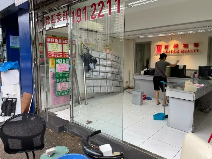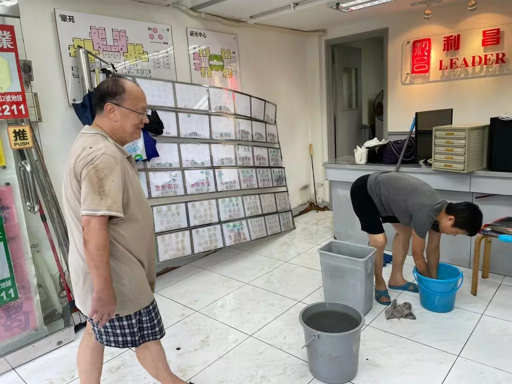 有地產舖門外的招牌也被浸壞,據職員講述,水位最深時浸過桌面,所有傢俬雜物都被浸,老闆損失慘重。