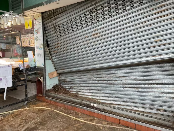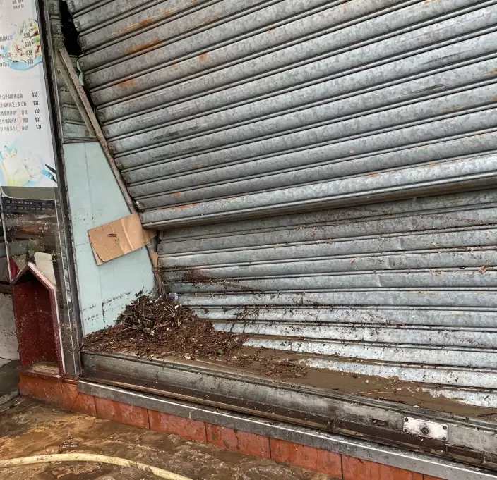 亦都有燒臘店閘門被水流衝力衝擊到變形,無法正常做生意。