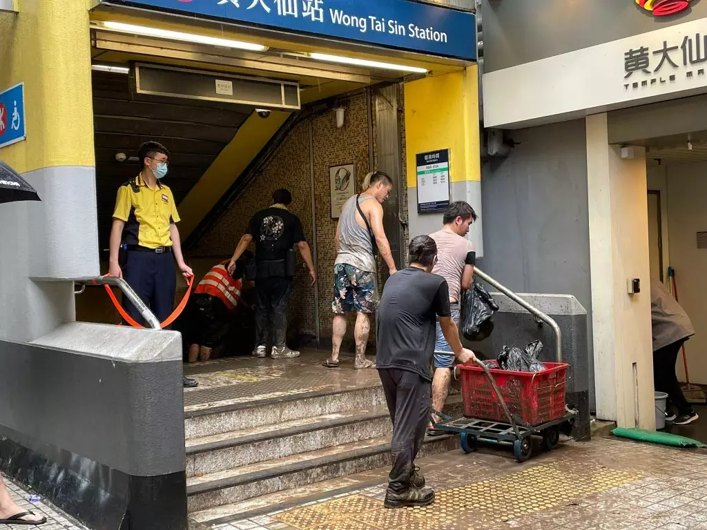 黑雨襲港,黃大仙港鐵站昨晚(7日)已出現嚴重水浸,有港鐵職員進行清理工作,當時隧道水浸已經升至胸口位置。