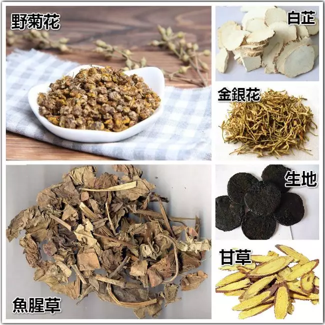 材料:野菊花、魚腥草、金銀花及生地各三十克、白芷十五克、甘草十克、水一公升。