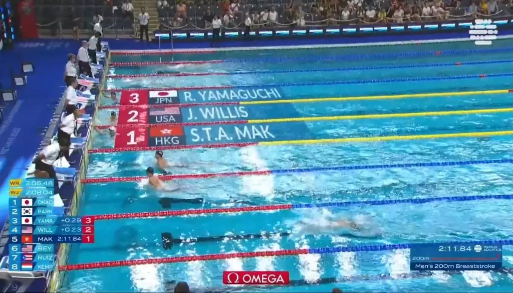 男子200米蛙泳決賽在上周四舉行,此前麥世霆在準決賽以第二名晉級,亦被視為奪牌大熱。在決賽中,麥世霆前段大部分時間都落後於旁邊線道的日本及美國選手,跟他們保持一段距離,惟至最後50米,麥世霆開始發力,後來居上最終以0.23秒之差壓過美國選手,取得香港男泳手史上首面世青賽金牌。