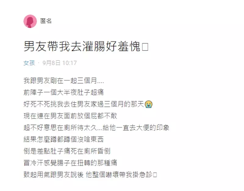 台灣一位女網友在網上發文,透露與男友拍拖即將滿3個月,約定在當天到男方家過夜,由於這是兩人首次一起生活,她十分注重自己的形象,沒想到卻因便秘而肚子疼,「在男友面前連個屁都不敢放,也不好意思在廁所待太久」。