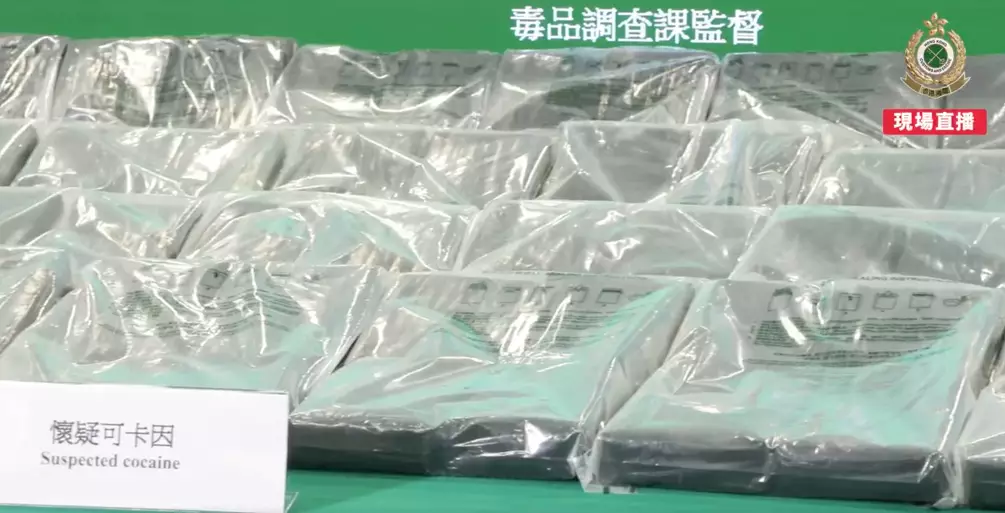 海關毒品調查科人員在葵涌突擊搜查一個工業大廈單位,檢獲230公斤懷疑可卡因,估計市值港幣1億8千萬元。